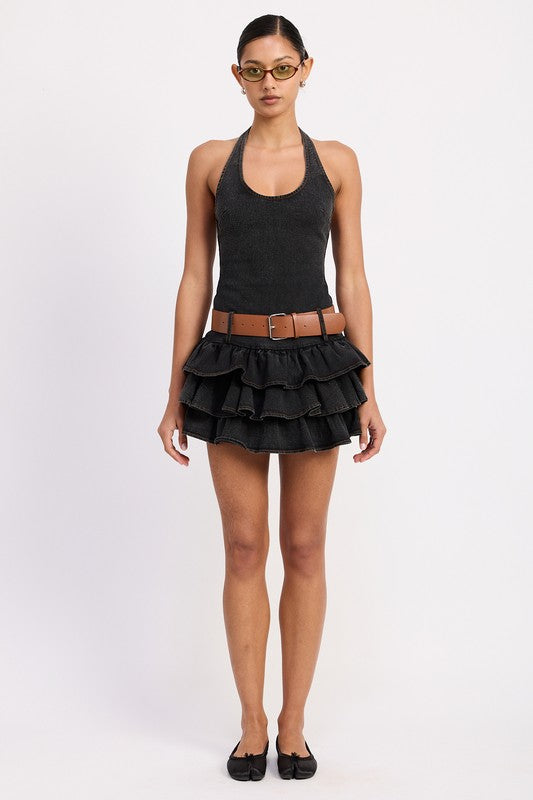 Mini Belted Ruffle Denim Dress